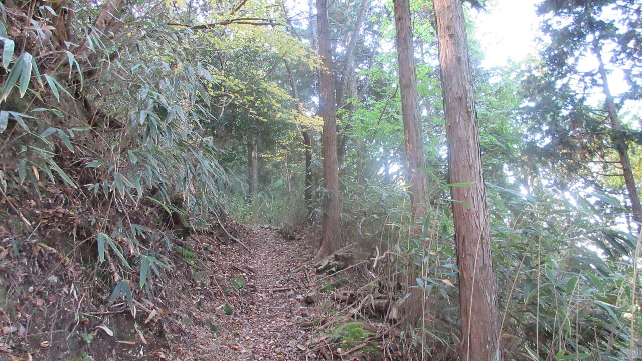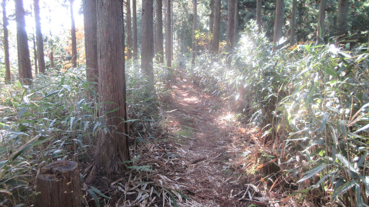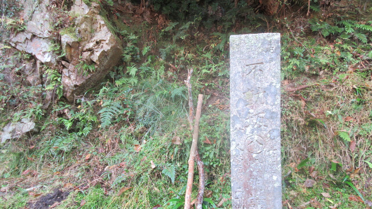 この看板から、舗装された新・不動坂から復元ルートの山道へ。